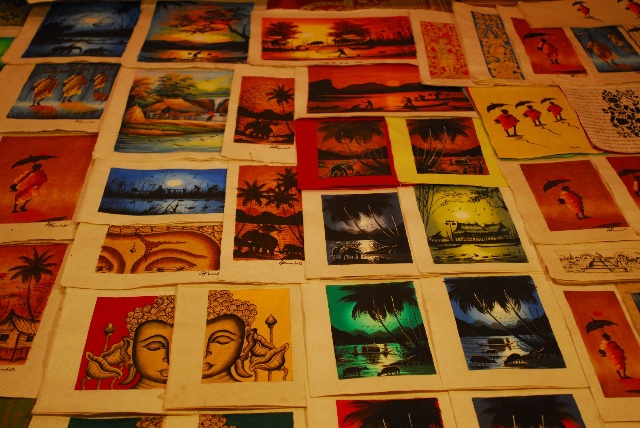 老撾原生態(tài)的手工藝造紙非常有名,也是在市場上最常見的一種工藝品,包括紙畫、紙燈罩、名信片、筆記本等種類。這種紙質(zhì)藝術(shù)品的繪畫內(nèi)容多與佛教有關(guān),極具老撾特色。