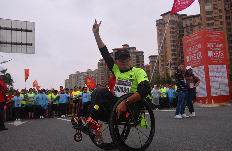 在眾多的選手中,坐在輪椅上的張先生顯得尤為搶眼。張先生來(lái)自廣州,他告訴記者,這是他參加的第54場(chǎng)馬拉松比賽,也是第一次參加全海景跑道的馬拉松, “我參加比賽不是為了出成績(jī)或出風(fēng)頭,而是重在參與,是想體現(xiàn)一種精神。”張先生說(shuō),他不一定能全部“跑”完全程,但他一定會(huì)堅(jiān)持到最后。